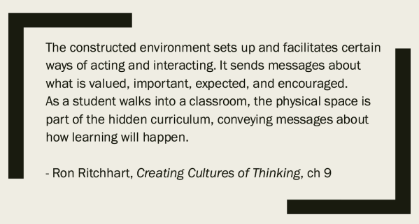 Sir Ken Robinson stated that “If you want to shift culture, it’s two things: its habit and its habitats – the habits of mind, and the physical environment in which people operate” (2010). Each of these exhibits was setting out to shift the culture, through both mind and environment. Which makes me ask the question, why aren’t schools creating wonderspaces? Ron Ritchhart, in Creating Cultures of Thinking, explains: