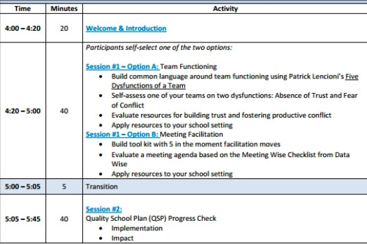 This freedom of time and space to connect with others, to engage in meaningful dialogue, and to reflect on possibilities is not often provided for educators. The box confines, and the box dictates, what should be thought about and when. Look at any PLC or meeting agenda and you’ll probably see something like this: